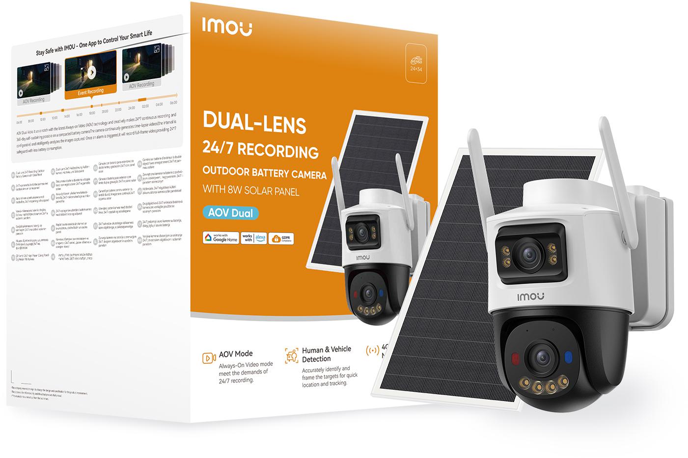 FotoaparátImou AOV Dual používá pokročilé technologieStále zapnuté video (AOV)který zajišťuje nepřetržité monitorování po celý den a zároveň šetří energii a místo pro záznam.