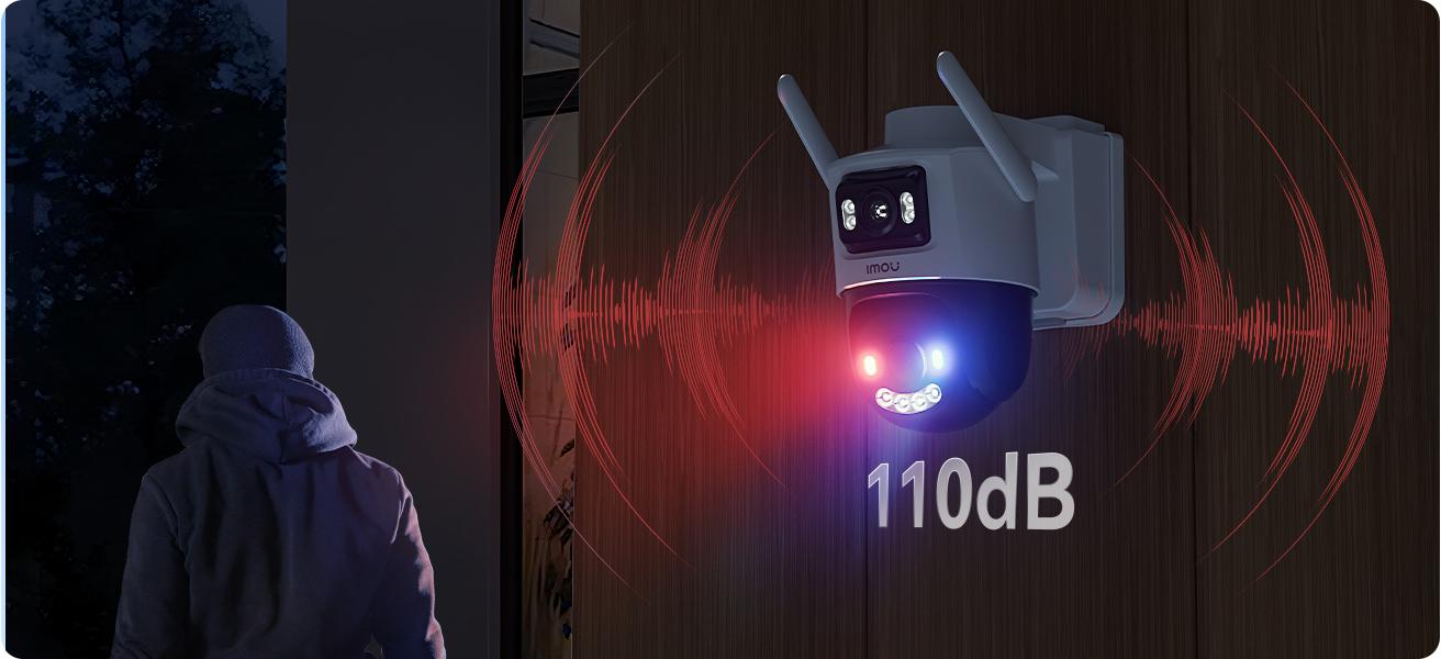 FotoaparátImou AOV Dual aktivně chrání váš web pomocívestavěná siréna s hlasitostí až 110 dB,světlomety ačerveno-modrá výstražná světla. Jedná se o účinný způsob, jak odradit narušitele ještě předtím, než dojde k ohrožení.