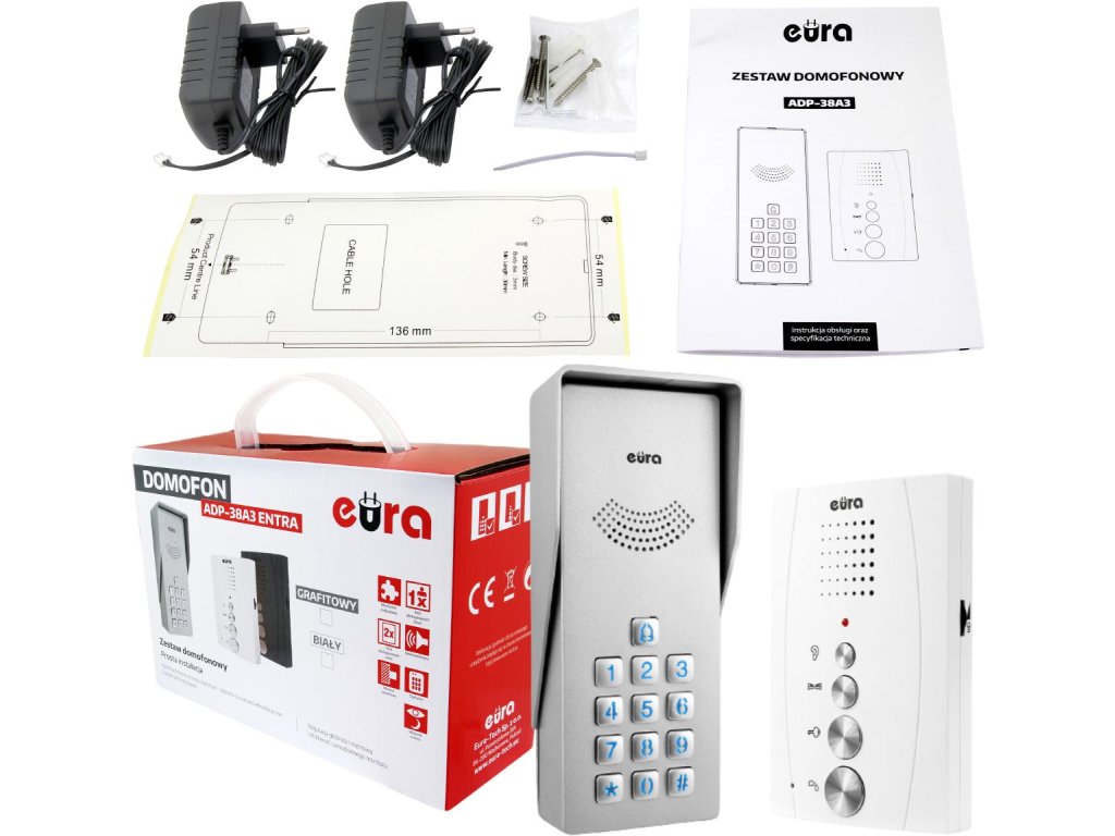 Interkom ADP-38A3 "ENTRA" se skládá z externího modulu (dveřní telefon), interního modulu (unifon) a dvou napájecích zdrojů.