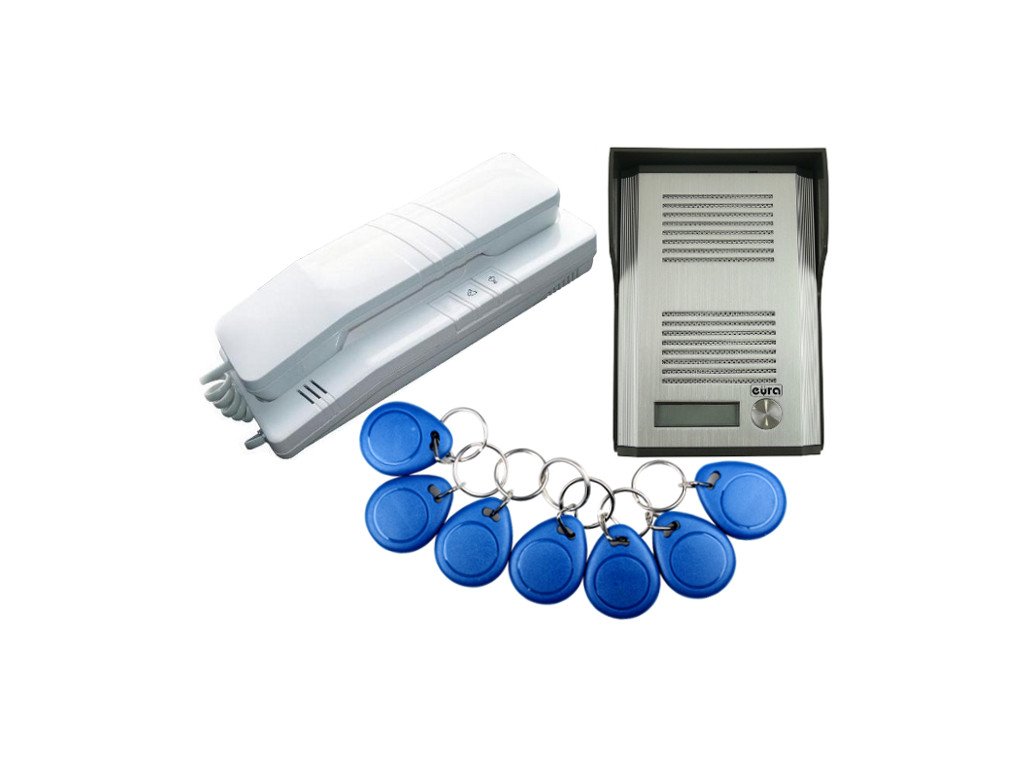 Interkom Eura RL-3203ID s bezdotykovou čtečkou je moderní sada, která slouží ke komunikaci mezi bytem a bránou nebo brankou. Sada interkomu se skládá z vrátného (externí modul), unifonu (interní modul) a napájecího zdroje. Modul interkomu je uzavřen v hliníkovo-plastovém pouzdře se speciální ochrannou střechou, která účinně chrání interkom před povětrnostními vlivy. Sada interfonů je určena pro povrchovou i zapuštěnou montáž. K interkomu je připojena speciální přístupová karta v podobě kroužku na klíče, která umožňuje bezdotykové otevření dveří.