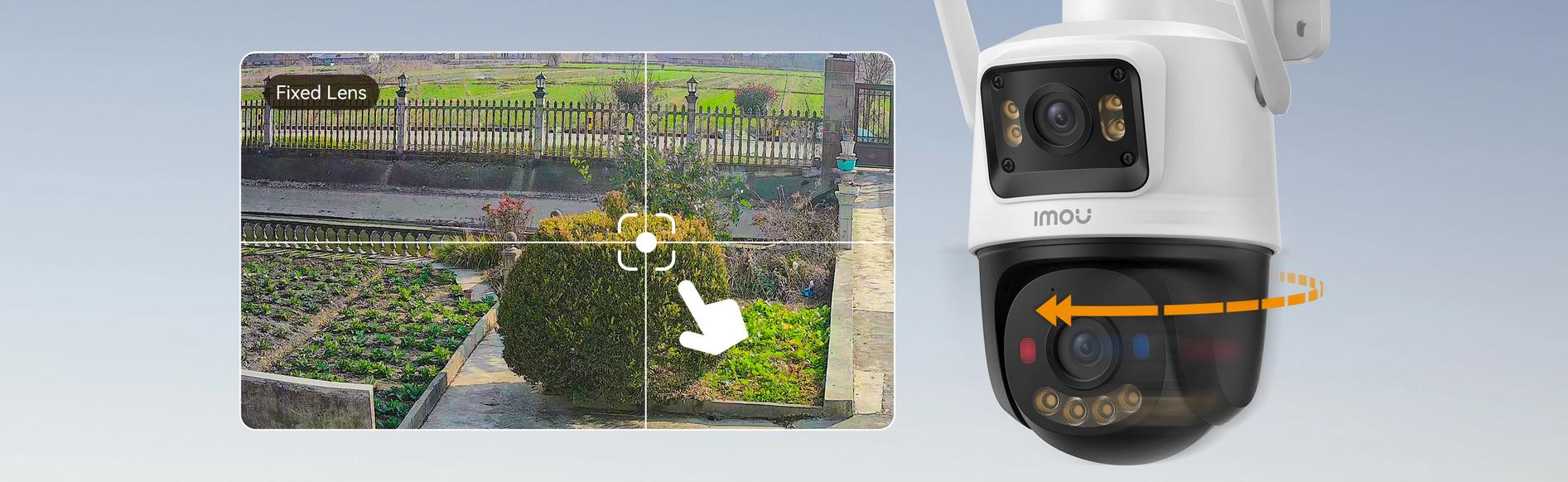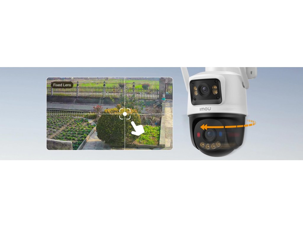Imou Cruiser Dual 2C 4G poskytuje plné pokrytí sledované oblasti kombinací pevných a otočných čoček. Objektiv PT umožňuje horizontální otáčení v rozsahu0-355° a vertikálně0-90°která vám umožní pozorně sledovat okolí a sledovat váš pohyb.