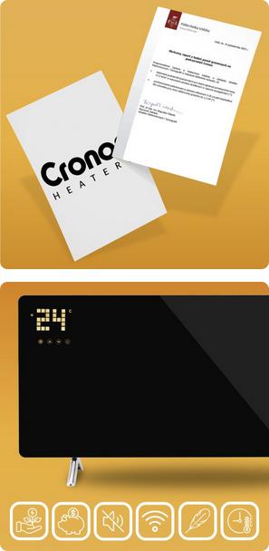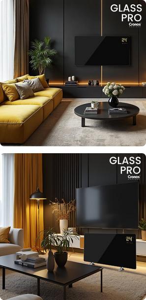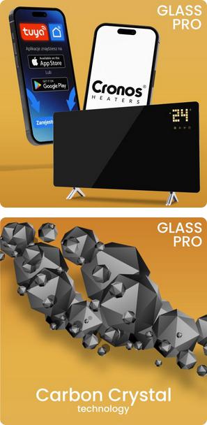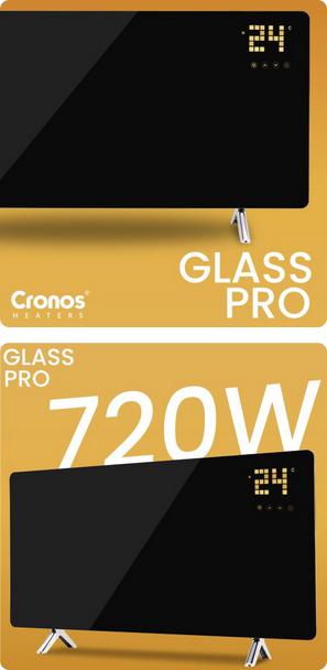 Cronos Glass Pro vyniká také svou energetickou účinností - pokročilé termostaty automaticky vypínají jednotku při dosažení nastavené teploty a zapínají ji při poklesu teploty, což umožňuje výrazné úspory účtů za elektřinu.