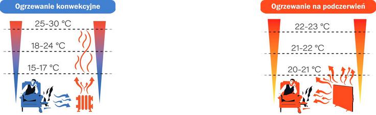 Konvekční a infračervené vytápění se liší především způsobem, jakým dodávají teplo do místnosti. Při konvekčním vytápění se teplo přenáší pohybem vzduchu - radiátory ohřívají vzduch, který stoupá vzhůru, a poté klesá, když se ochlazuje. Tento cyklus způsobuje neustálé promíchávání vzduchu, což může vést k nerovnoměrnému rozložení teploty a k jevu zvedání prachu, který škodí alergikům.