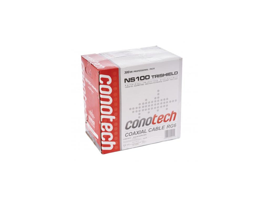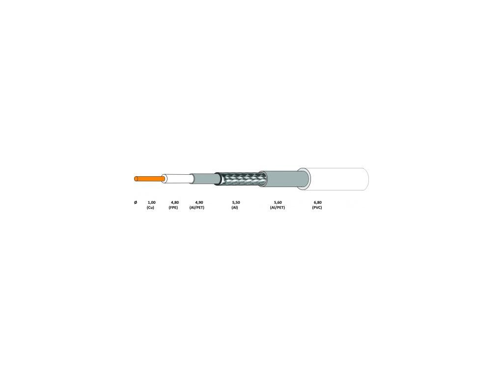 Vysoká kvalita, trojnásobně stíněný koaxiální kabel typ RG6, s vnitřním vodičem z měděného drátu o průměru 1,00 mm . Vodič má plášť z polyethylenu fyzikálně napěněného dusíkem (N), který se vyznačuje obzvláště účinnou dielektrickou izolací. Stínění kabelu je provedeno v souladu s normou Trishield, v němž je použita trojitá ochrana jádra tvořená vrstvou hliníkové fólie AL/PET, cop hliník s mírou pokrytí až 90 % a další vrstva hliníkové fólie AL/PET. Vnější plášť je vyroben z polyvinylchloridu (PVC) bílé barvy o průměru 6,8 mm, který slouží jako ochrana proti mechanickému poškození a umožňuje rychlé a pohodlné vedení kabelu.
