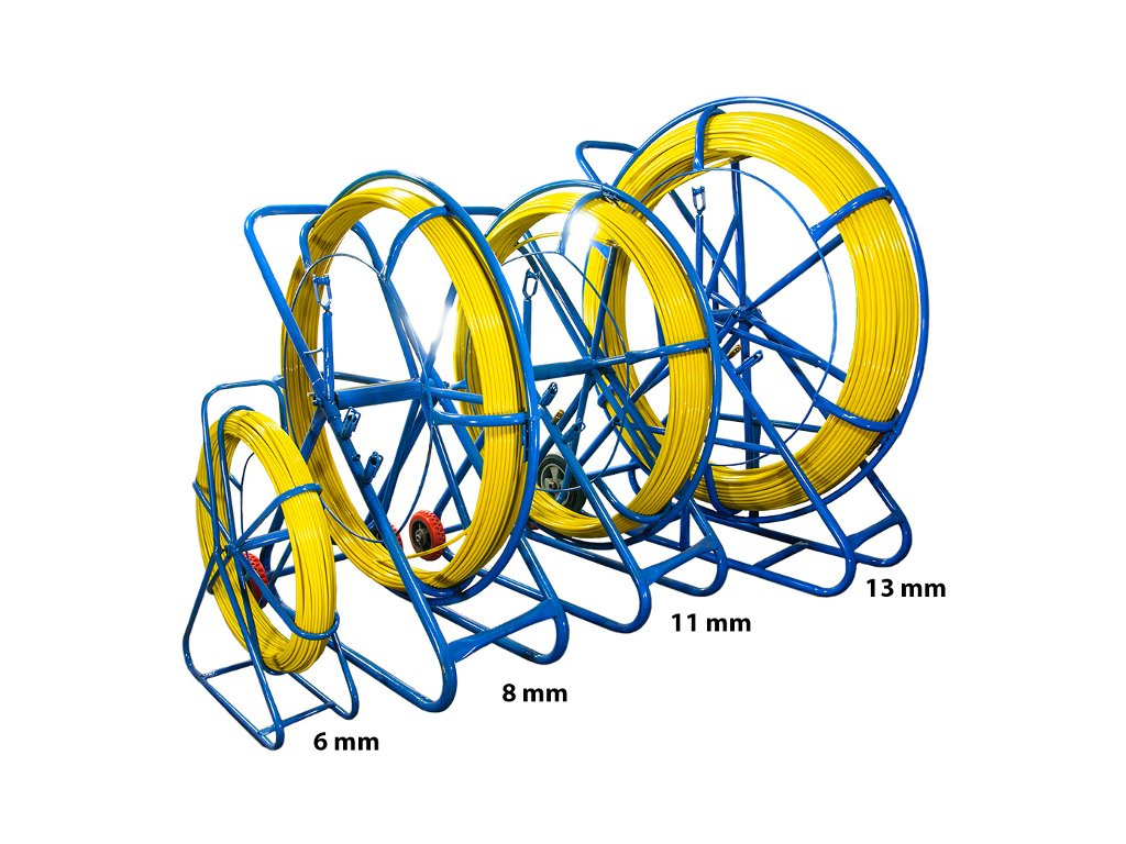 Skleněná vlákna pro tahání kabelů v teletechnických instalacích. Dodává se na otočném kotouči pro pohodlnou přepravu, skladování a použití vlákna. Vlákno je pokryto žlutým PE pláštěm pro ochranu a lepší skluz. Vlákno je vybaveno očkem pro montáž příslušenství. Buben je vybaven očkem pro pohodlné vedení vláken.