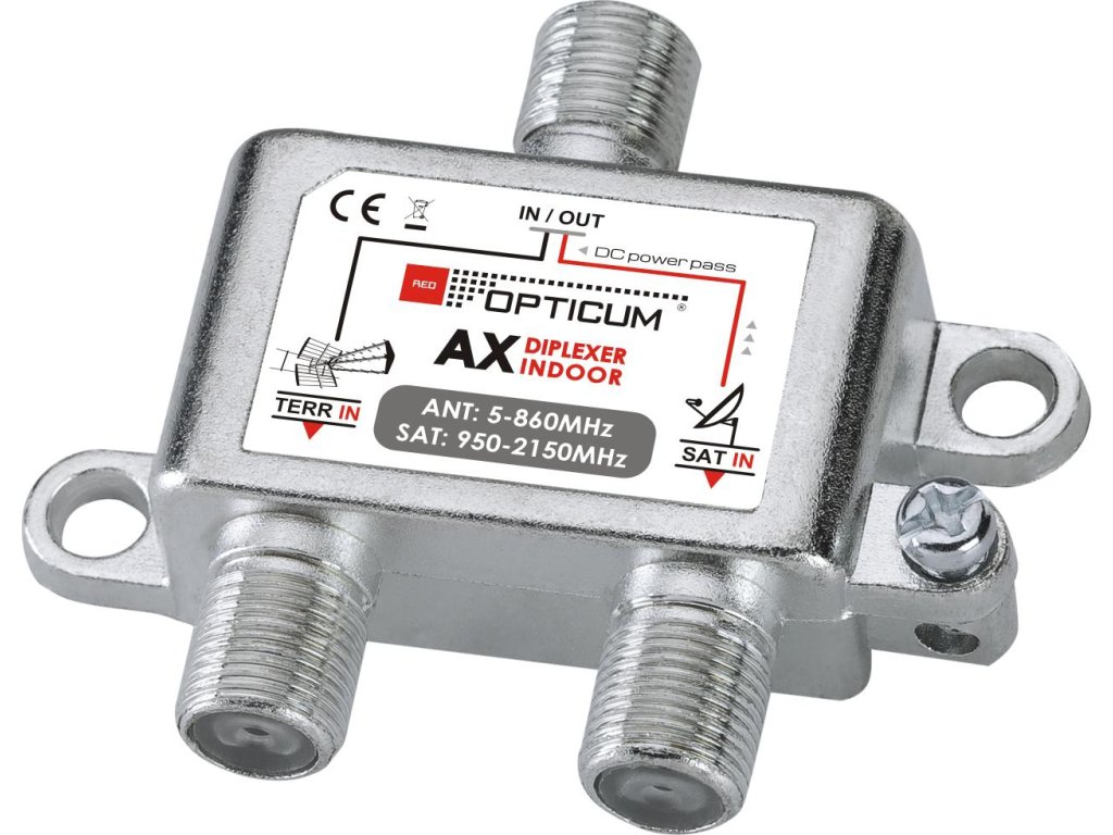 DIPLEXER INDOOR kombinátor shrnuje satelitní signál z jednoho LNB s pozemním TV signálem (vnitřní). Umožňuje přenos součtového signálu do jednoho přijímače. Pro oddělení signálu na konci instalace je nutné použít svorkovnici.