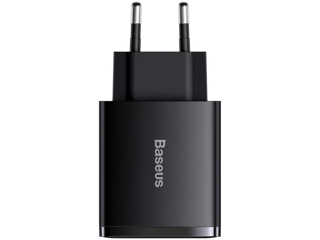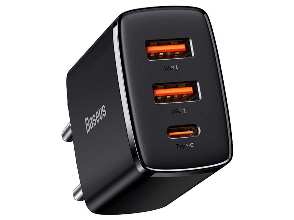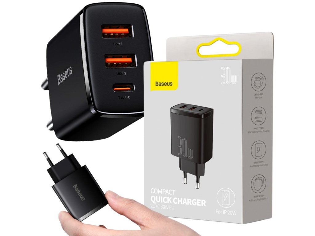 - Nabíječka Baseus Compact Quick Charger CCXJ-E01 30W 2x USB-A 1x USB-C PD 3.0 QC 3.0 vám umožní zbavit se únavné nutnosti nosit s sebou dvě nabíječky. To vše díky speciálnímu designu.