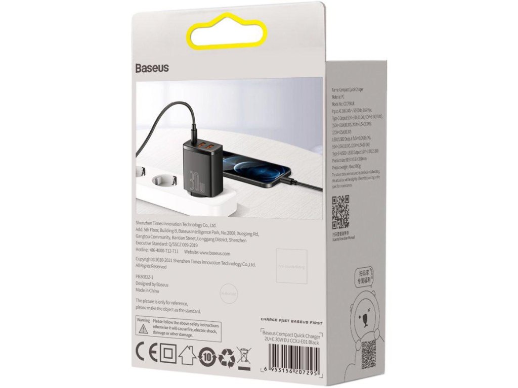 - Zabezpečení : nabíječka Společnost Baseus dbá na bezpečnost Vaše zařízení. Nabíječka Kompaktní rychlonabíječka Baseus CCXJ-E01 30W je vybaven ochranou proti přepětí, přehřátí, zkratu a dalším možným nebezpečím, která chrání vaše zařízení před poškozením.