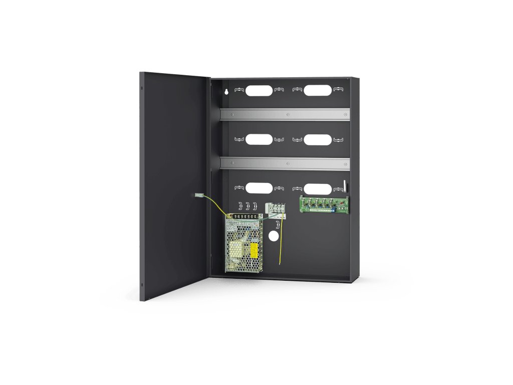 Skříň je vybavena dvěma lištami DIN, vyrovnávacím zdrojem 13,8 V/4 A, tamperovým spínačem a odpojovačem napájení s pojistkou. Přístup do vnitřku skříně je chráněn šroubovacími dvířky. Volitelně lze dvířka opatřit zámkem na klíč. Skříň je vyrobena z ocelového plechu s práškovým nástřikem v antracitově šedé barvě.