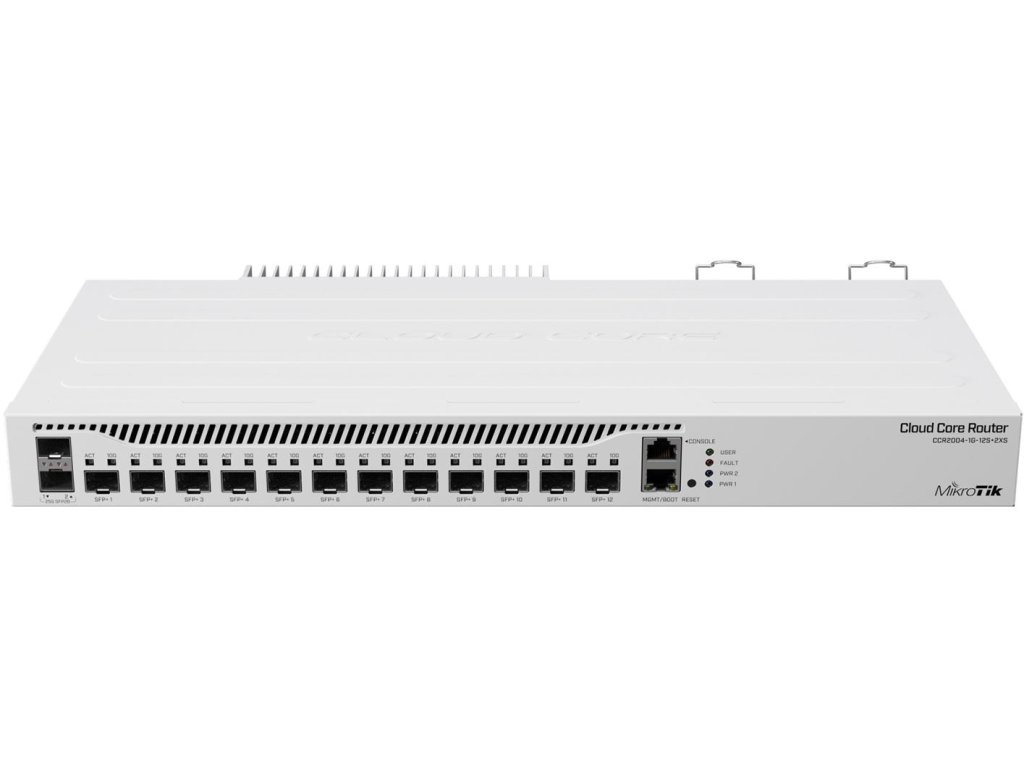 MikroTik Cloud Core Router 2004-1G12S+2XS je prvním zástupcem řady 2 routerů CCR. Zařízení je vybaveno 1 gigabitovým ethernetovým portem, 12 sloty SFP+ (10 Gb/s) a 2 sloty SFP28 (25 Gb/s). Poskytuje tedy vysokou šířku pásma a řadu možností připojení. Bude ideální pro většinu internetových sítí. Šasi bylo navrženo pro montáž do 19" racku a součástí balení jsou i uši.