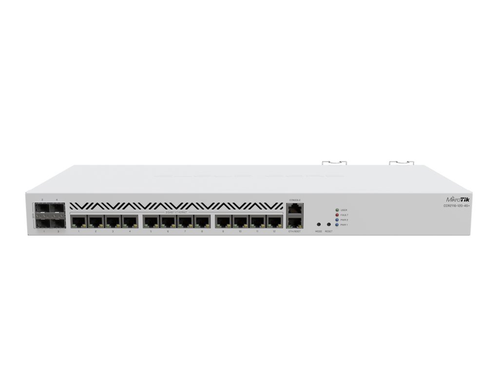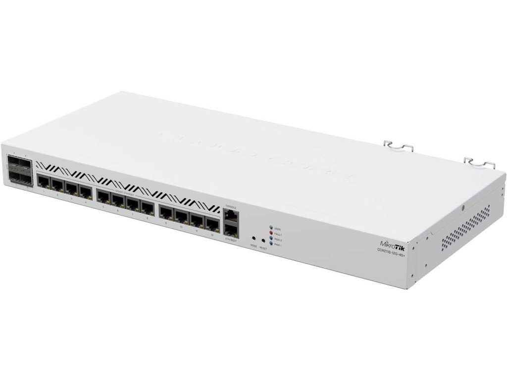 Router je vybaven 13× gigabitovými ethernetovými porty, z nichž 12× prochází přes čip Marvelam a 1× je připojen přímo k procesoru a je určen pro správu. Kromě toho má směrovač ještě 4x sloty 10G SFP+ (mají samostatnou plně duplexní linku připojenou k přepínacímu čipu Marvell rodiny Amethyst), aktivní chlazení, dva redundantní zdroje napájení a slot PCIe M.2. Každá skupina 4 portů má samostatné plně duplexní připojení k přepínacímu čipu. Nejsou zde žádná úzká místa. Ve většině konfigurací můžete očekávat propustnost téměř jako u přepínače. Cloud Core Router CCR2116-12G-4S+ bude ideální pro většinu internetových sítí. Stejně jako všechna zařízení CCR má klasické bílé rackové šasi 1U, vhodné pro montáž do 19" racku (uši jsou součástí dodávky).