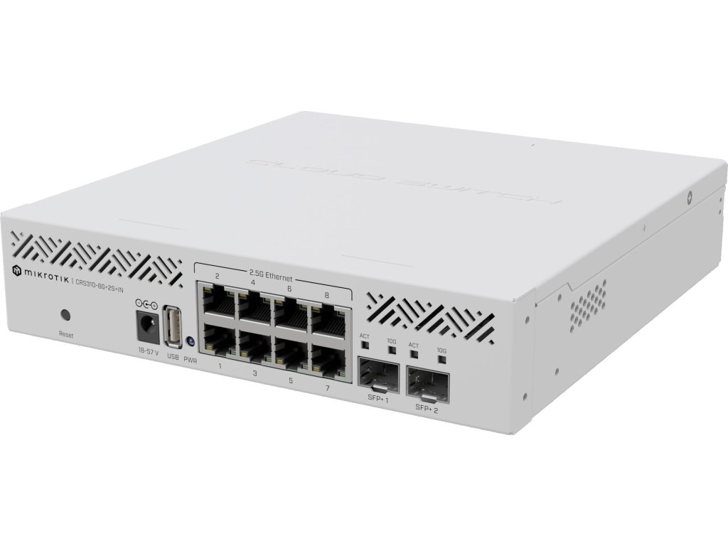 MikroTik CRS310-8G+2S+IN je pokročilý síťový přepínač, který v sobě kombinujeosm portů 2,5 Gigabit Ethernet zdva 10gigabitové porty SFP+, který nabízí flexibilitu a vysoký výkon v kompaktním provedení. Porty SFP+ podporují různé přenosové rychlosti: 1G, 2,5G a 10G, což umožňuje přizpůsobení konfigurace.