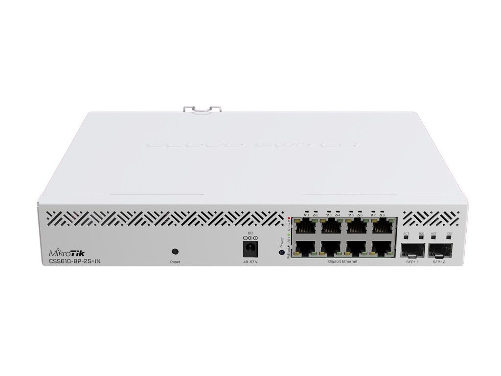 MikroTik Cloud Smart Switch CSS610-8P-2S+IN je řízený 8portový přepínač s 8 porty Gigabit Ethernet (802.3af/at PoE-out) a 2 sloty SFP+ pro 10 Gb/s optické připojení. Maximální neblokující propustnost je 28 Gb/s, přepínací kapacita 56 Gb/s a rychlost předávání paketů 41,7 Mp/s.