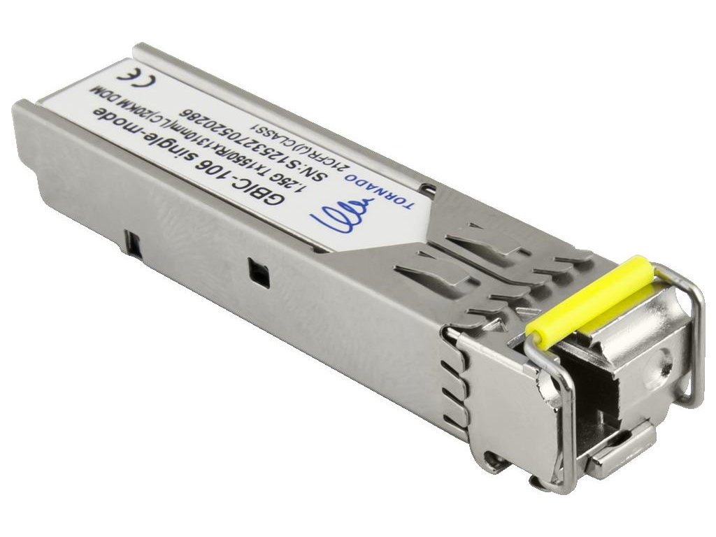 Modul GBIC-106 SFP, jednovidový, 1,25G, Tx:1550 / Rx:1310, LC, 20KM, DDM (TORNADO) Použití: Modul GBIC-106 SFP je určen k převodu elektrického signálu na optický. Je určen pro přenos po jednovidových optických vláknech (SM)Doplňkové parametry