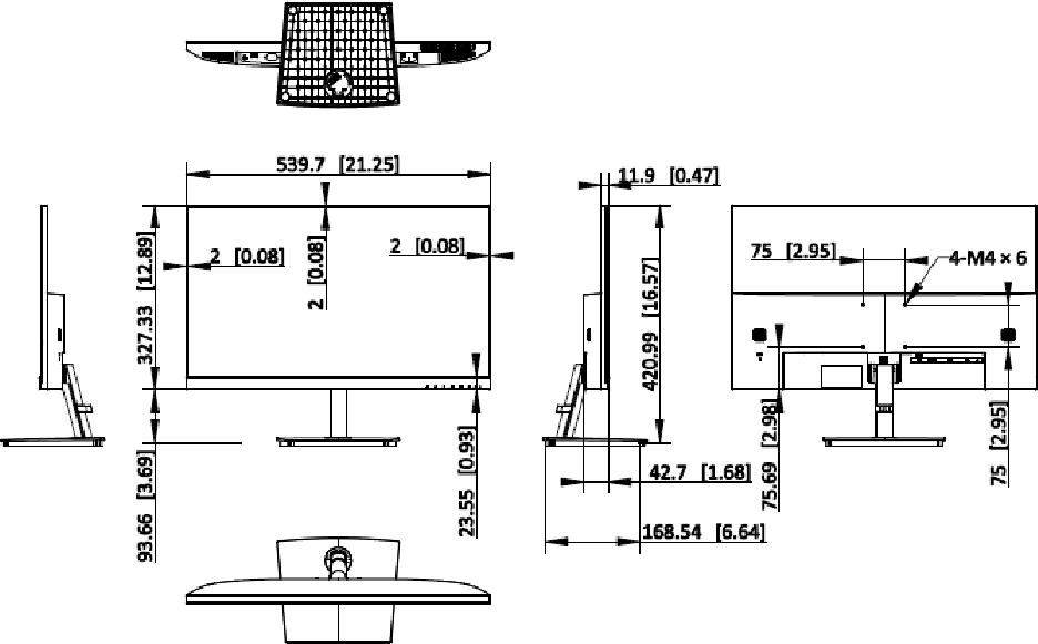 | Rozměry výrobku (š × v × h) | S podstavcem: 539.7 (š) mm × 427,82 (v) mm × 185,74 (h) mm; 21,25 (š) × 16,84 (v) × 7,31 (h) in. Bez podstavce: 539.7 (š) mm × 327,33 (v) mm × 42,7 (h) mm; 21,25 (š) × 12,89 (v) × 1,68 (h) palce |