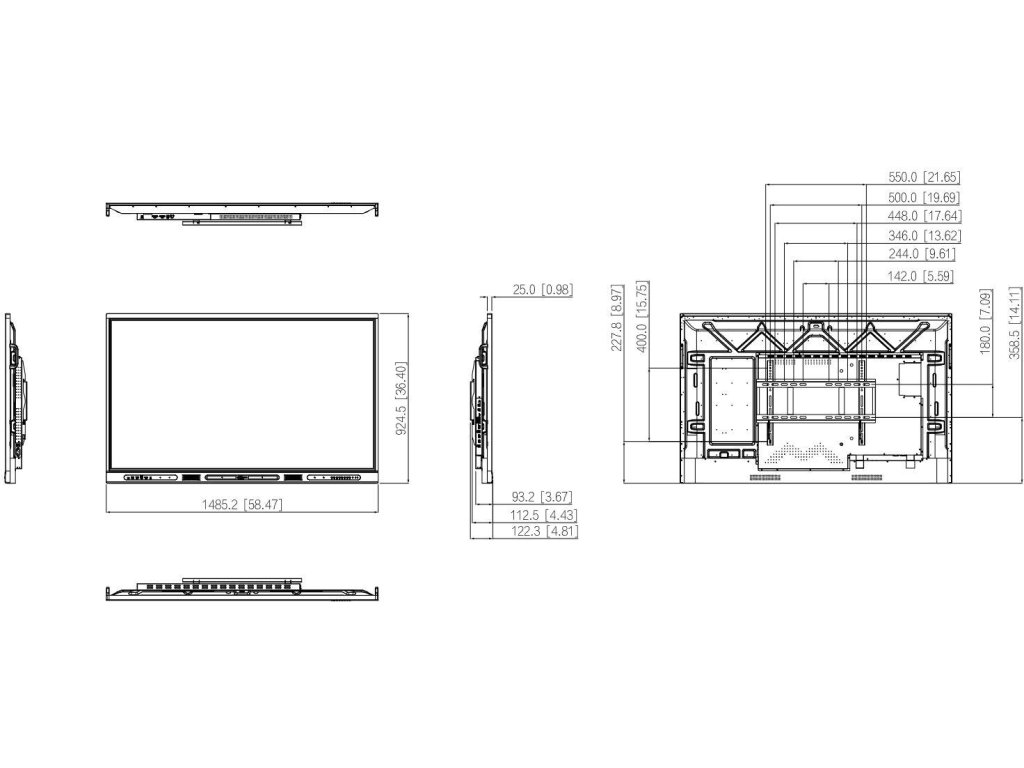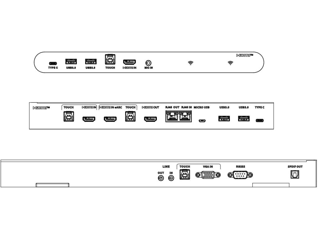 | Zadní porty | Typ C × 1 (4K@60 Hz, dotykový) Vstup HDMI × 2 (4K@60 Hz) Vstup VGA × 1 (1080p@60 Hz) USB 3.0 typ B × 3 (dotykové) Výstup HDMI × 1 USB 3.0 typ A × 2 Micro USB × 1 RS-232 × 1 Vstup RJ45 × 1 Výstup RJ45 × 1 Audio In × 1 (3,5mm port, slouží k přehrávání zvuku z VGA) Audio výstup × 1 (3,5 mm port) Výstup SPDIF × 1 (optický port) Slot OPS × 1 |