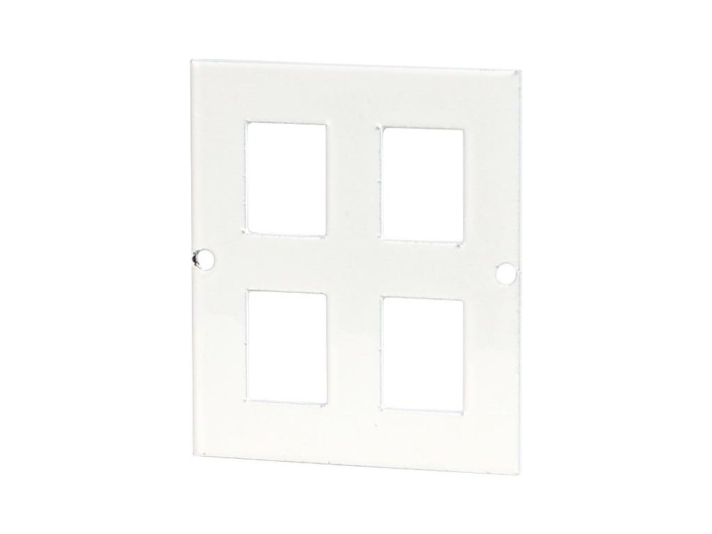 Montážní deska určená pro instalaci do multimediální skříně Getfort. Deska má 4 otvory pro montáž modulů RJ45