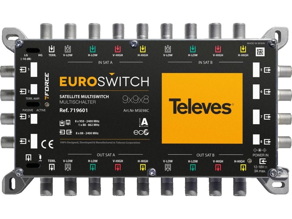 Použití jako koncový multipřepínač (topologie hvězda) nebo kaskádový multipřepínač (nastavení přepínače). Vybaven přepínačem pro aktivaci technologie TForce, která automaticky upravuje pozemní signál a udržuje jej konstantní i přes rozdíly v příjmu.