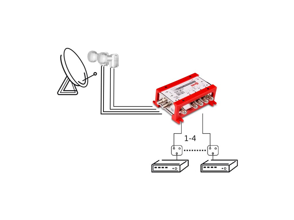 Anténní kabely připojující signály k zařízení musí být co nejkvalitnější a musí splňovat příslušné technické normy, aby umožňovaly správnou funkci zařízení. Zařízení umožňuje připojit až 4 satelitní přijímače. Multiswitch automaticky rozpozná druh signálu, který bude přenášen do přijímačů.