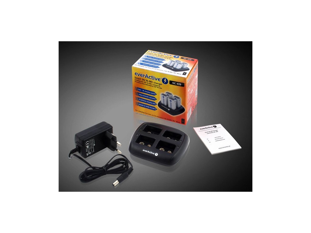 Nabíječka everActive NC 109 je jedinečná specializovaná konstrukce umožňující nabíjení 1 až 4 9V Ni-MH akumulátorů - každý článek se nabíjí samostatně .