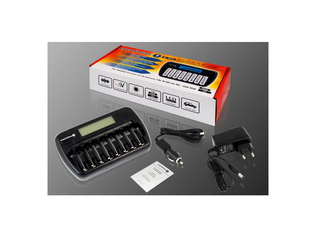 Nabíječka everActive NC 800 má až 8 nezávislých nabíjecích kanálů pro akumulátory Ni-MH velikosti R6/AA nebo R03/AA, každý článek se nabíjí samostatně .
