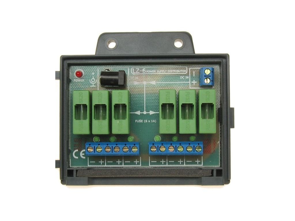 LZ-6 je pasivní zařízení, které pomáhá při řádném větvení napájení z jedné vyšší napájecí jednotky. Přepínač rozděluje napájení na 6 výstupů, z nichž každý je chráněn pojistkou a je vybaven LED diodou, která informuje o jeho přepálení (nesvítí, což znamená, že pojistka je přepálená). LZ-6 má dvě vstupní zásuvky, které jsou vzájemně propojeny. Nezáleží na tom, do kterého konektoru je napájení přivedeno, což umožňuje připojení buď pomocí zástrčky DC 2,1/5,5, nebo pomocí izolovaných vodičů. Umožňuje také sériové připojení konektorů, např. napájení do zásuvky DC IN, ze svorek kabelu (DC IN), kabelem WT-2.1 do druhého konektoru LZ-6. Zařízení je ideální pro připojení napájecího zdroje s konektorem 2,1/5,5 mm ke kabelům YAP75 napájejícím kamery. Kabel CCTV YAP75-0,59/3,7+2x0,5 má 2 vodiče po 0,5 mm2. Teoretický odpor je 3,4Ω/100m. Výrobce kabelu uvádí 5,5Ω/100m. Při napájení kamery 12 V pomocí kabelu YAP75 a za předpokladu poklesu napětí na 11 V lze napájení přenášet na vzdálenosti uvedené v tabulce.