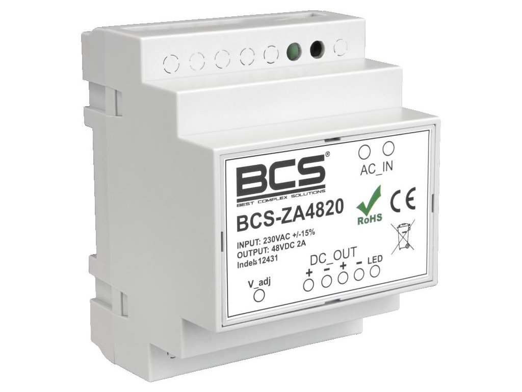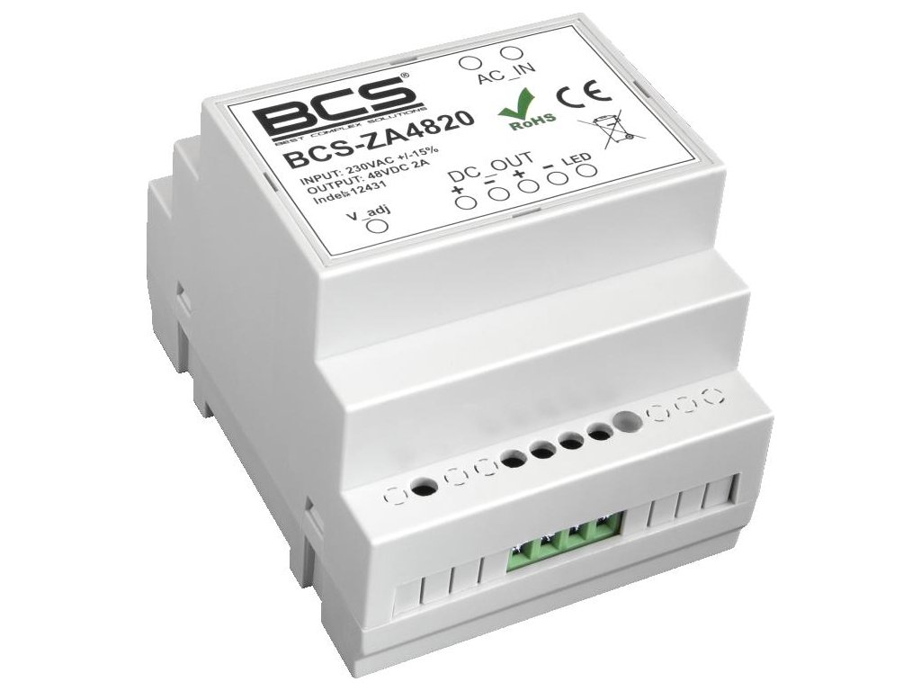 BCS-ZA4820 je napájecí jednotka, která se dokonale hodí pro náročná elektronická zařízení, jako jsou kamery CCTV, DVR, přepínače nebo IP adaptéry pro dvouvodičový interkomový systém. Díky stabilnímu napětí, ochraně proti přepětí a zkratu a automatickému návratu po odstranění zkratu se doporučuje zejména pro použití v monitorovacích systémech vyžadujících vysokou spolehlivost napájení. Napájecí obvod je tvořen vysoce výkonným zesilovacím měničem, který zajišťuje izolaci mezi sítí 230 V AC a napájeným zařízením.