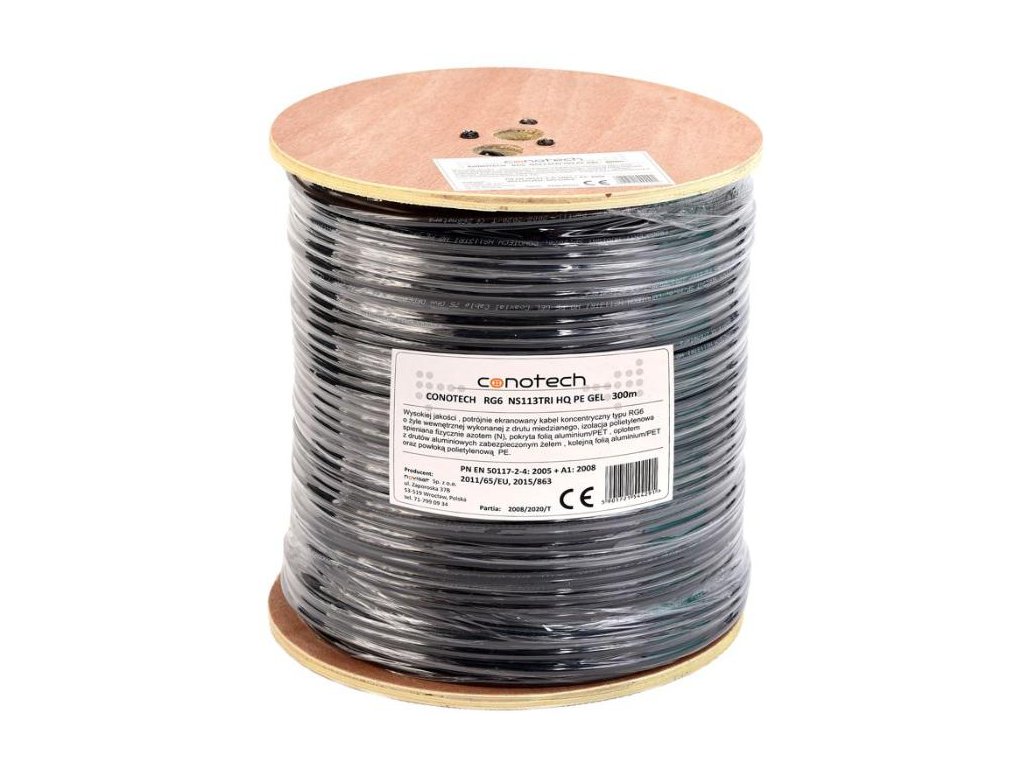 Vysoce kvalitní trojnásobně stíněný koaxiální kabel RG6 s průměrem měděného vodiče 1,13 mm. Standardní stínění Trishield se skládá z hliníkové fólie, hustě opleteného opletu (98 %) a další vrstvy hliníkové fólie. Hydrofobní gel chrání před vlhkostí a polyethylenový vnější plášť) chrání před poškozením a povětrnostními vlivy. Dusíkem napěněná polyethylenová izolace poskytuje vynikající dielektrickou ochranu. Kabel NS113TRI GEL se vyznačuje vysokou účinností stínění třídy A/A+.