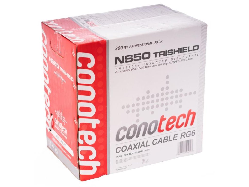Trojnásobně stíněný koaxiální kabel typu RG6 s vnitřním vodičem z měděného drátu o průměru 0,8 mm, polyethylenovou izolací fyzikálně napěněnou dusíkem (N), pokrytou hliníkovou/PET fólií, hliníkovým opletením a PVC pláštěm.