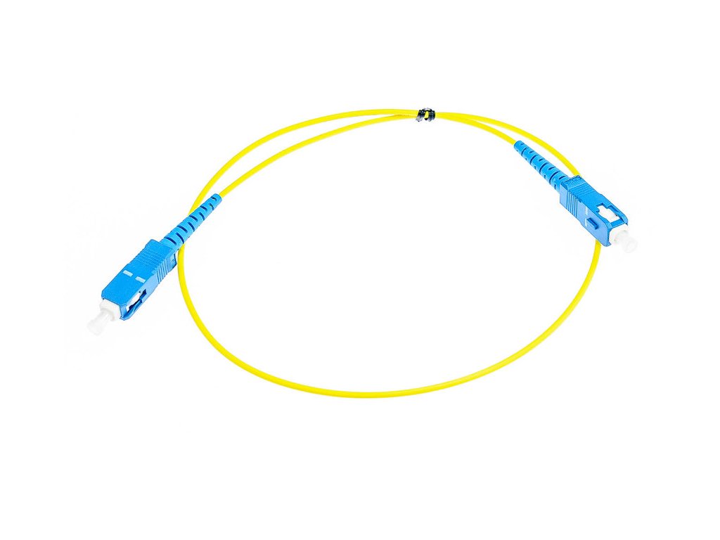 Optický patchcord SIMPLEX o průměru 2 mm, typ konektoru SC/UPC-SC/UPC. Patchcord umožňuje například propojení optických portů v teleinformačních skříních.