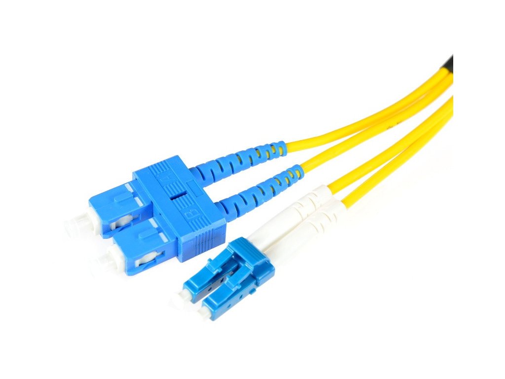 Optický patchcord typu DUPLEX o průměru 3 mm, typ konektorů SC-LC. Patchcord umožňuje například propojení optických portů v teleinformačních skříních.