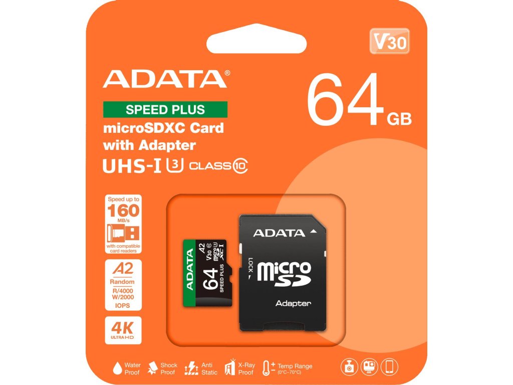 Paměťová karta microSD Adata Speed Plus 64 GB je spolehlivým řešením pro každého, kdo potřebuje rychlé a bezpečné místo pro svá data. S ní získáte nejen rychlost, ale také jistotu, že vaše vzpomínky jsou chráněny za všech podmínek. Jedná se o kartu, která bude držet krok s vašimi požadavky - jak v práci, tak v každodenním životě.