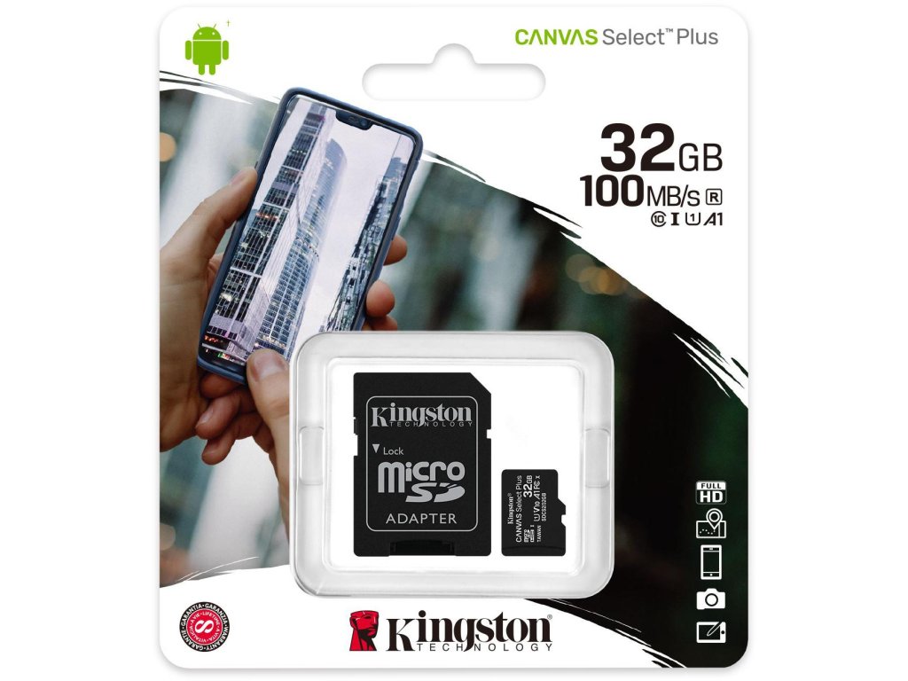 Paměťová karta microSD Canvas Select Plus od společnosti Kingston je kompatibilní se zařízeními se systémem Android a nabízí výkon třídy A1. Rychlejší karta s kapacitou až 512 GB1 urychluje načítání aplikací a umožňuje ukládat fotografie a videa. Karta microSD Canvas Select Plus se může pochlubit obrovským výkonem, rychlostí a odolností. Spolehlivě ukládá a zpracovává fotografie a videa v rozlišení Full HD. Karty Kingston Canvas jsou důkladně testovány na odolnost v nejnáročnějších prostředích a pracovních podmínkách, takže si je můžete vzít na cesty a mít jistotu, že vaše fotografie, videa a soubory jsou v bezpečí.