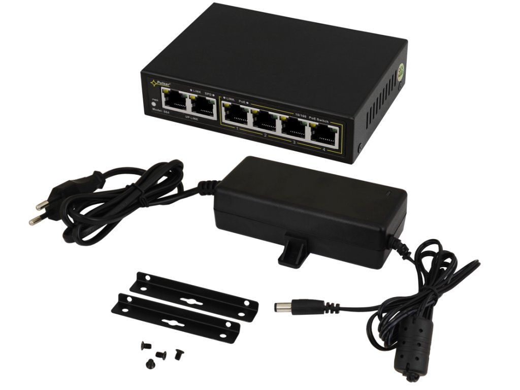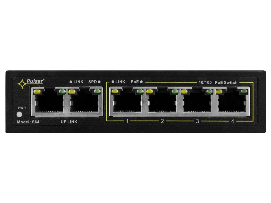 Switch Pulsar S64 je moderní model 6portového síťového přepínače, který je určen k napájení IP kamer pracujících ve standardu IEEE802.3af/at. Zařízení na portech 1 až 4 má zabudovanou funkci automatické detekce zařízení napájených ve standardu PoE.