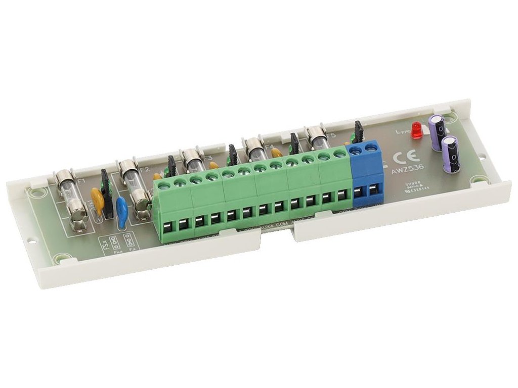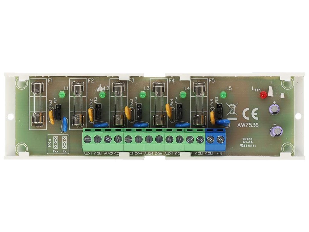 Pojistkový blok LB5/5x0,5A/2,5/AW je určen pro distribuci napájení v nízkonapěťových systémech vyžadujících napětí 10V÷30V DC nebo 10V÷24V AC (např. vyrovnávací PSU, transformátor atd.). Má vstup IN pro připojení napájecího zdroje a pět nezávisle chráněných napájecích výstupů AUX1÷AUX5. Každý výstup AUX je vybaven ochranou proti zkratu (SCP) v podobě 0,5A F pojistky nebo 0,5A PTC polymerové pojistky (možnost instalace 1A pojistek, nejsou součástí dodávky) a ochranou proti přepětí - varistory. Stav výstupů je indikován pěti LED diodami L1÷L5. Porucha pojistky je signalizována zhasnutím příslušné LED: L1 pro AUX1, L2 pro AUX2 atd. Kromě toho se v případě poruchy aktivuje výstup FPS (stav hi-Z) a dioda . Výstup FPS lze použít k dálkovému ovládání stavu modulu, např. k externí optické signalizaci. Modul je vhodný pro připojení kabelů o maximálním průřezu 2,5 mm² .