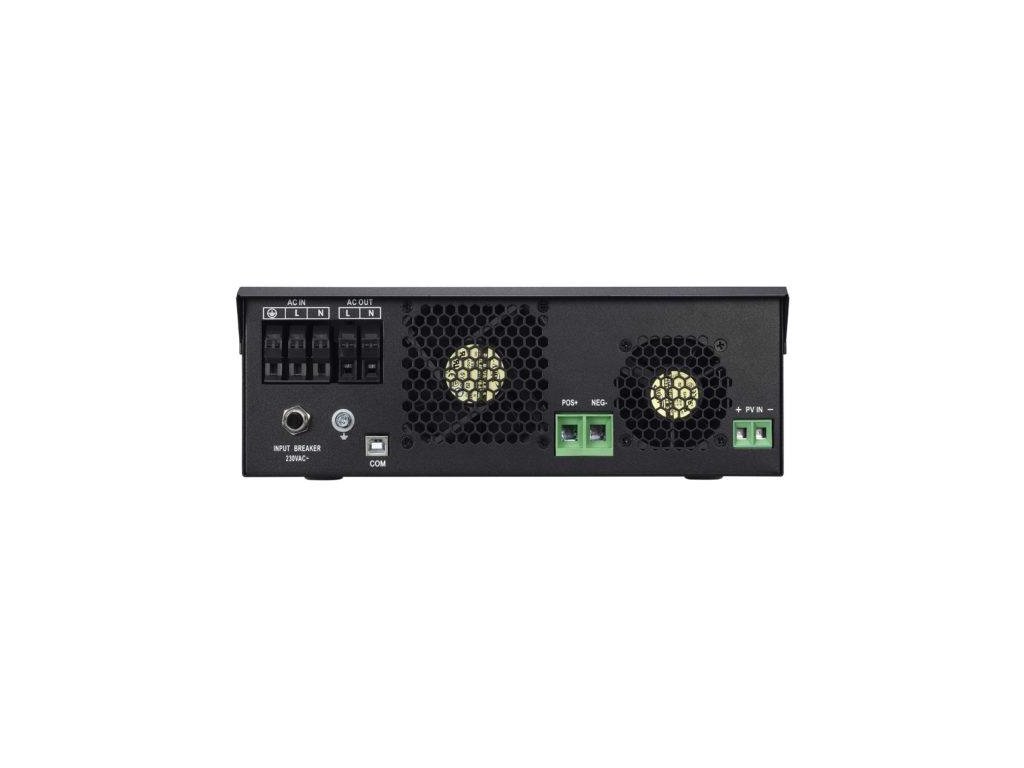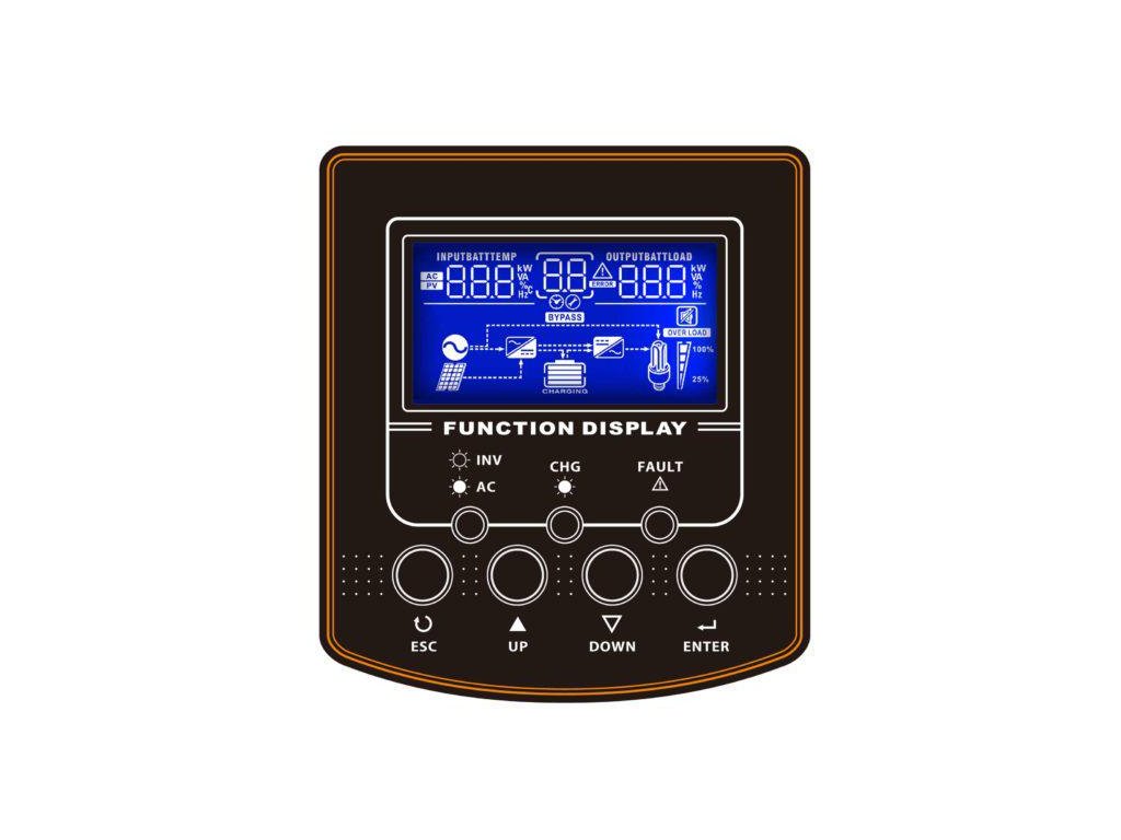 Komplexní LCD displej umožňuje uživatelsky snadno konfigurovatelná tlačítka, jako je nabíjecí proud baterie, priorita AC/FV (solární) nabíječky a přípustné vstupní napětí v závislosti na aplikaci.