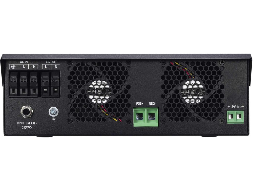 Komplexní displej LCD umožňuje uživatelsky snadno konfigurovatelná tlačítka, jako je nabíjecí proud baterie, priorita AC/FV (solární) nabíječky a přípustné vstupní napětí v závislosti na aplikaci.