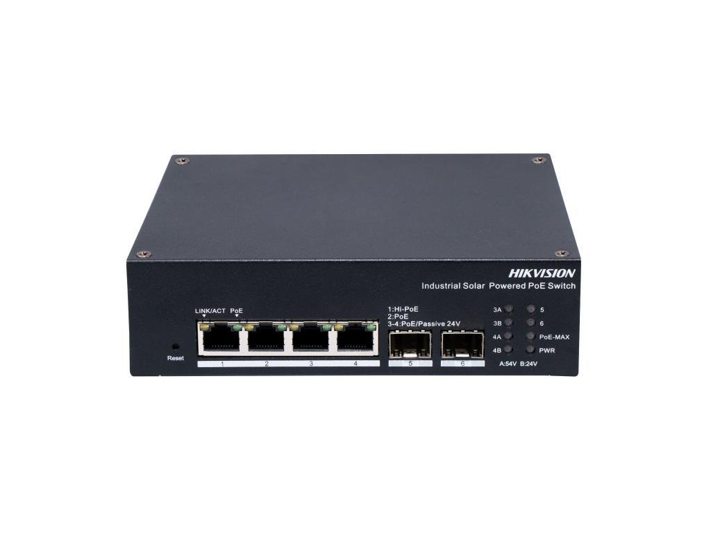 | Porty | 4 × gigabitové porty PoE RJ45, 2 × gigabitové porty SFP (optická vlákna), 1 × port RS485 |