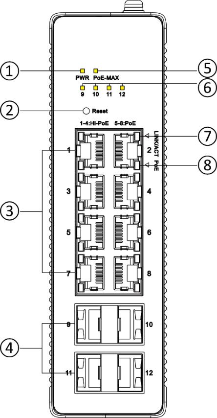 - Porty8 × gigabitových portů RJ45 PoE, 4 × optických portů SFP