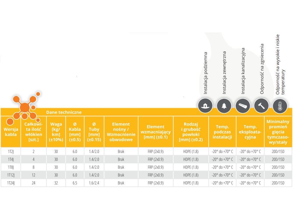 | Min. poloměr ohybu dočasný / trvalý | 20D / 15D |