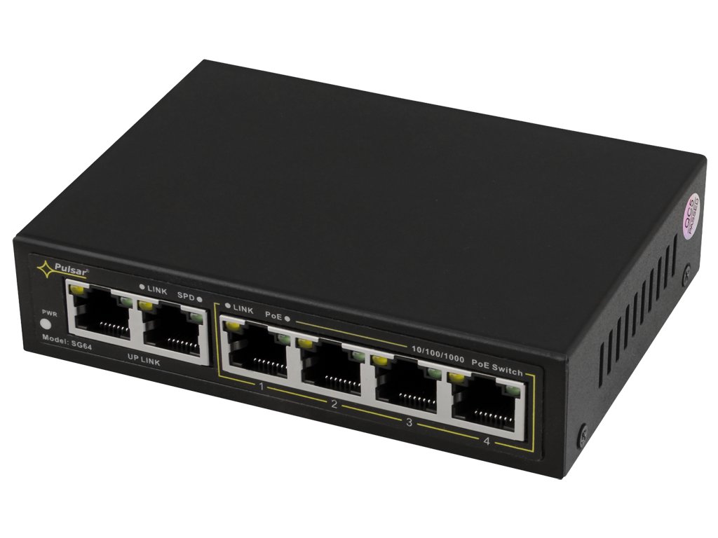 SG64 je 6portový PoE switch určený k napájení IP kamer pracujících podle standardu IEEE802.3af/at. Přepínač na portech 1 až 4 má funkci automatické detekce zařízení napájených ve standardu PoE. Porty označené UP LINK slouží k připojení jiného síťového zařízení. Přední panel indikuje stav zařízení pomocí LED diod.Technologie PoE zajišťuje síťové připojení a snižuje náklady na instalaci tím, že pro každé zařízení není potřeba samostatný napájecí kabel. Technologie PoE poskytuje síťové připojení a snižuje náklady na instalaci, protože odpadá nutnost vést ke každému zařízení samostatný napájecí kabel.
