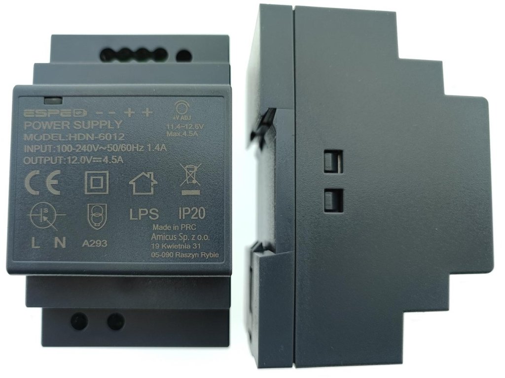 ESPE-HDN6012 je vysoce kvalitní a účinný spínaný zdroj v plastovém krytu pro montáž na lištu DIN TS35 mm o šířce 3U. Jeho konstrukce je založena na vysoce kvalitních elektronických součástkách, které umožňují nepřetržitý a dlouhodobý provoz. Je spolehlivý, plně chráněný a stabilní. Poskytuje vysokou účinnost a vynikající technické parametry. Perforovaný kryt zajišťuje dobré větrání a trimr umožňuje přesné nastavení napětí pro kompenzaci úbytku napětí na přívodech. Dvojité výstupní svorky usnadňují připojení zátěže.