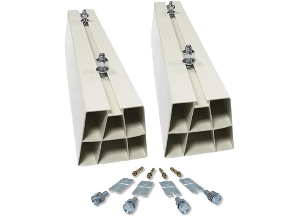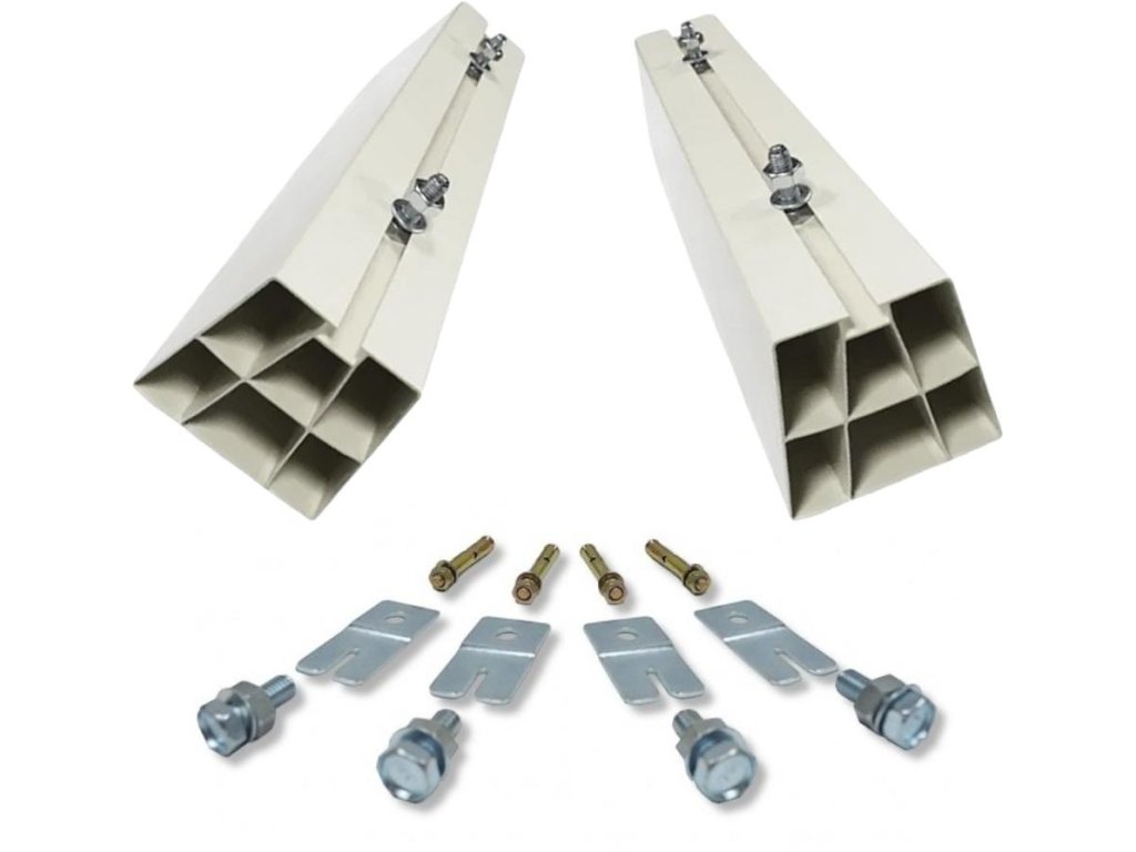 Podstavec na podlaze pro vysokou stabilitu klimatizační jednotky. Vyrobeno z pevného PVC odolného proti UV záření. Skvěle se hodí k montáži venkovní jednotky v místech, kde není nutné nebo možné namontovat jednotku na stěnu budovy. Součástí dodávky jsou dva podstavce a montážní příslušenství.