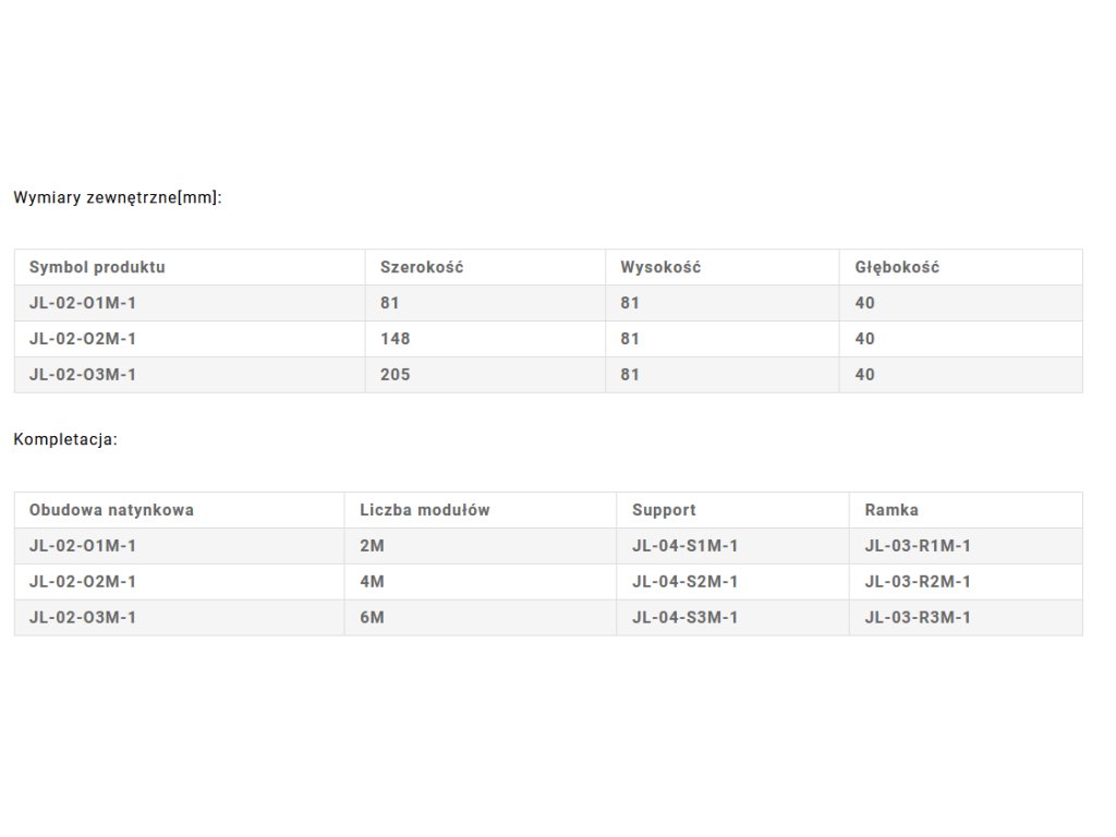 Dvojitý rám pro instalaci modulárního mozaikového systému. Je určen pro použití s vyhrazenými skříňkami pro povrchovou montáž (typ 4M, tj. JL-02-O2M-1) a skříňkami pro zapuštěnou montáž (typ 4M, tj. JL-06-2PG-1). Rámeček je uzpůsoben pro instalaci mozaikových kování, což umožňuje konstrukci povrchových a pod omítku montovaných logických, elektrických a audio-video-datových zásuvek (např. HDMI, SVGA, USB, SC APC atd.).