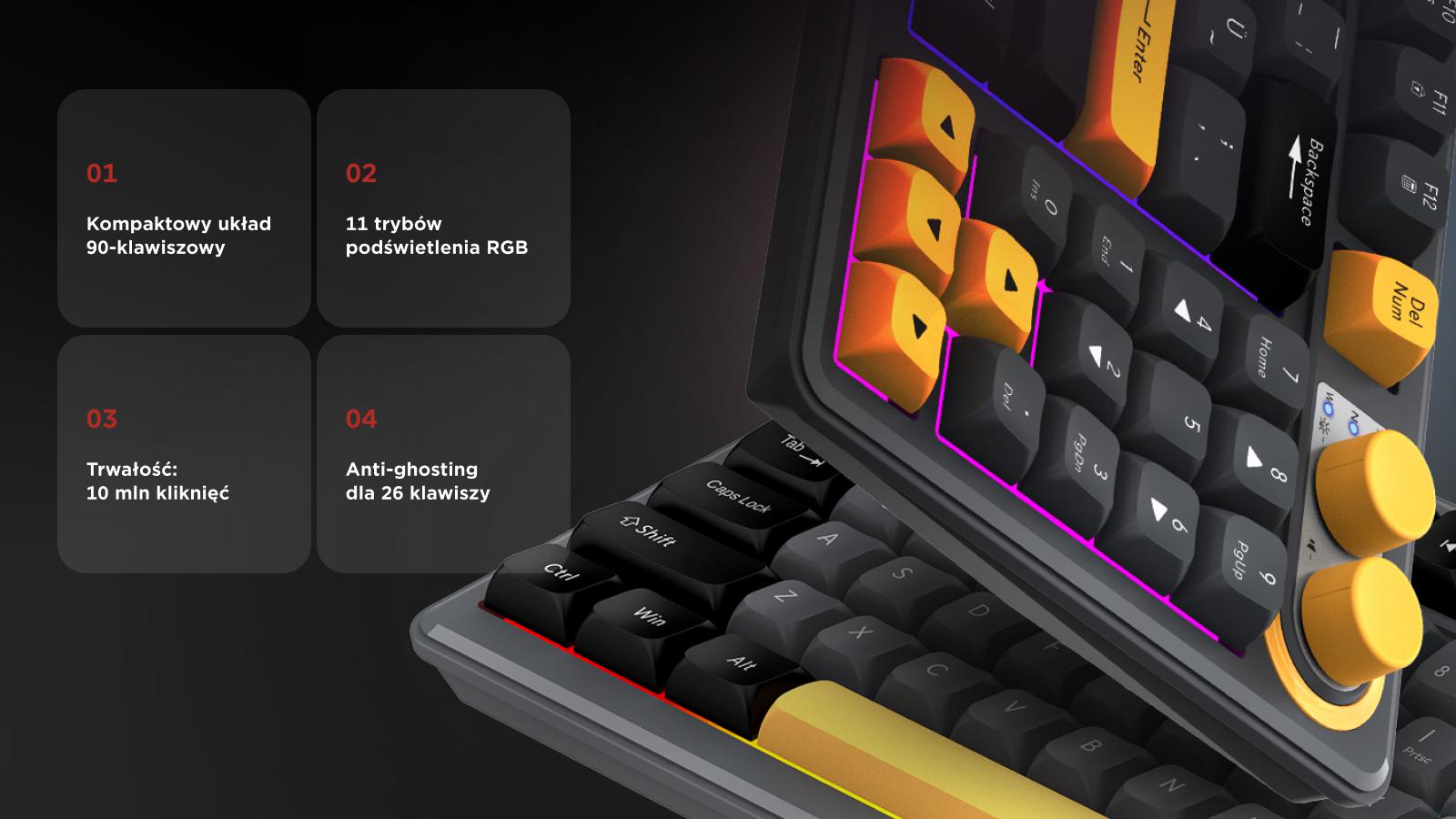 - Klávesnice 90 %, kompaktní provedení:Ušetříte místo na stole a zároveň si zachováte plnou funkčnost pro hraní her a práci.