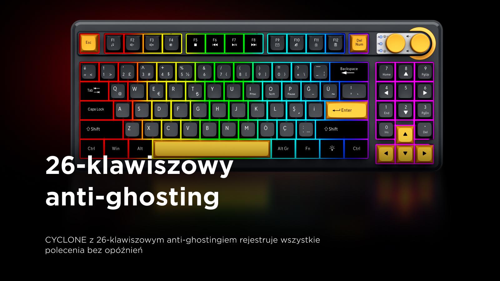 Hra se zrychluje, soupeř mačká a vy mačkáte několik kláves najednou - Cyclone je všechny přečte. systém Anti-Ghosting s 26 klávesami eliminuje chyby a dává vám výhodu tam, kde ostatní ztrácejí kontrolu.