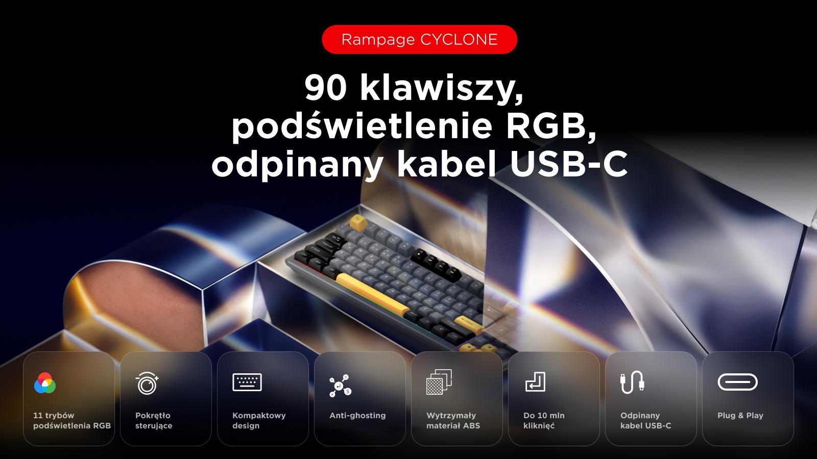Klávesnice je srdcem hráčské pracovní stanice - Rampage Cyclone ji zrychluje a září plným RGB. Je to herní klávesnice, která kombinuje kompaktní 90% design, výrazné RGB podsvícení v 11 režimech a bezchybný výkon díky technologii Anti-Ghosting na 26 tlačítkách. Navržena pro hráče, kteří chtějí hardware s charakterem a stylem.