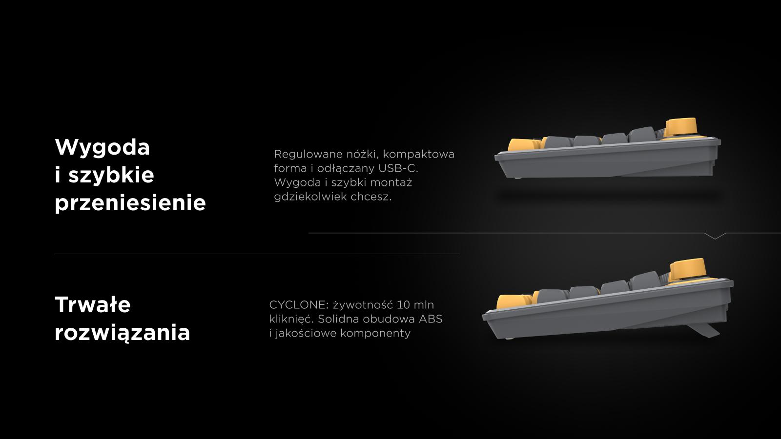 Cyclone je klávesnice stvořená pro dlouhé herní seance - membránová konstrukce vydrží až 10 milionů kliknutí, takže můžete hrát každý den bez obav o svůj hardware. Díky odpojitelnému kabelu USB typu C se snadno přenáší a robustní konstrukce znamená, že s vámi vydrží dlouho.