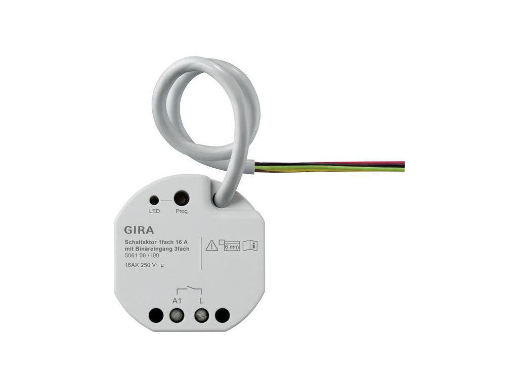 Podpovrchový reléový aktor 1x 16 A společnosti GIRA je zařízení pro spínání elektrických spotřebičů. Má tři binární vstupy pro připojení běžných spínačů, tlačítek a snímačů pohybu s bezpotenciálovými kontakty. Tyto vstupy slouží k ovládání dalších aktorů Gira One nebo k záznamu stavových hlášení.