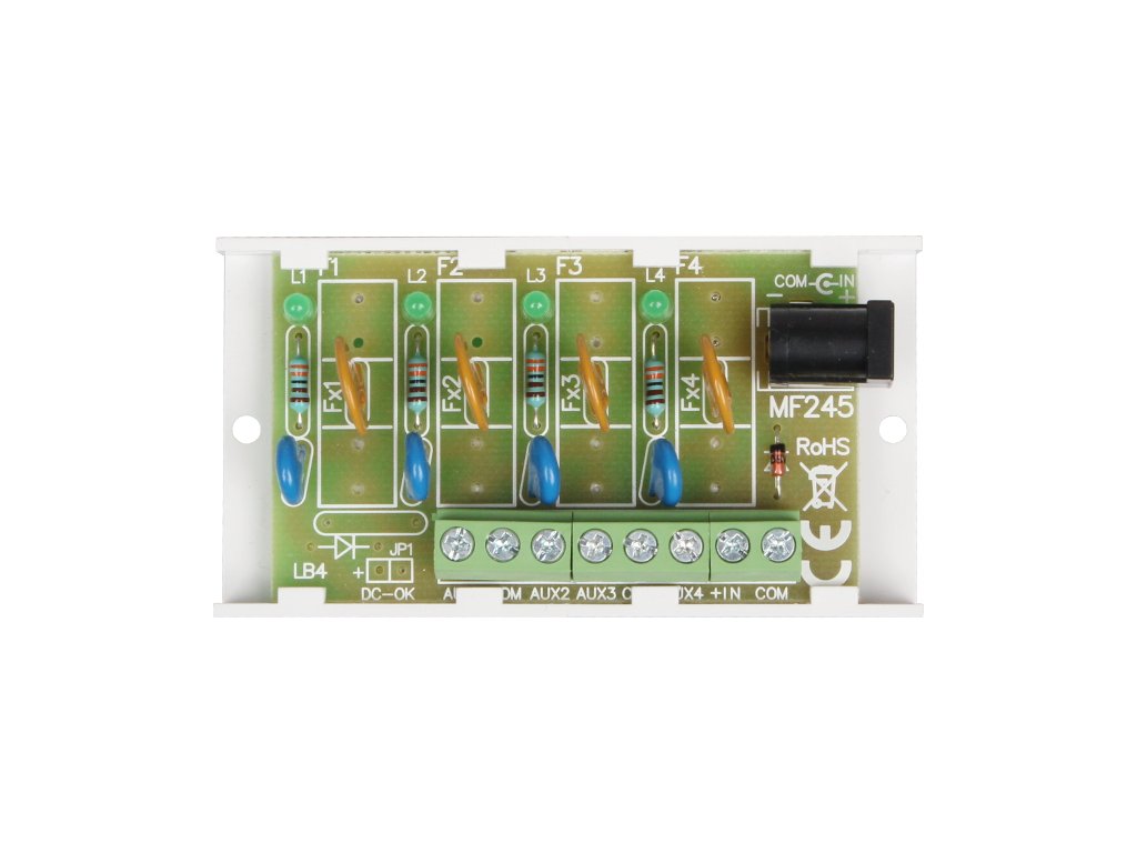 Pojistkový modul je určen pro rozvod energie v nízkonapěťových zabezpečovacích systémech (rozvod energie). Má dva napájecí vstupy: šroubovací konektor IN a zásuvku DC 5,5/2,1. Modul přijímá napětí v rozsahu 10 V÷ 30 V DC. Modul má čtyři nezávisle chráněné napájecí výstupy AUX1÷AUX4. V závislosti na verzi jsou výstupy AUX1÷AUX4 chráněny pojistkami nebo polymerovými pojistkami. Selhání pojistky nebo aktivace pojistky PTC je signalizováno zhasnutím příslušné diody LED: L1 pro AUX1 atd. Každý výstup modulu je navíc chráněn varistorem, který chrání napájecí zdroj a přijímače před přepětím v napájecím systému.